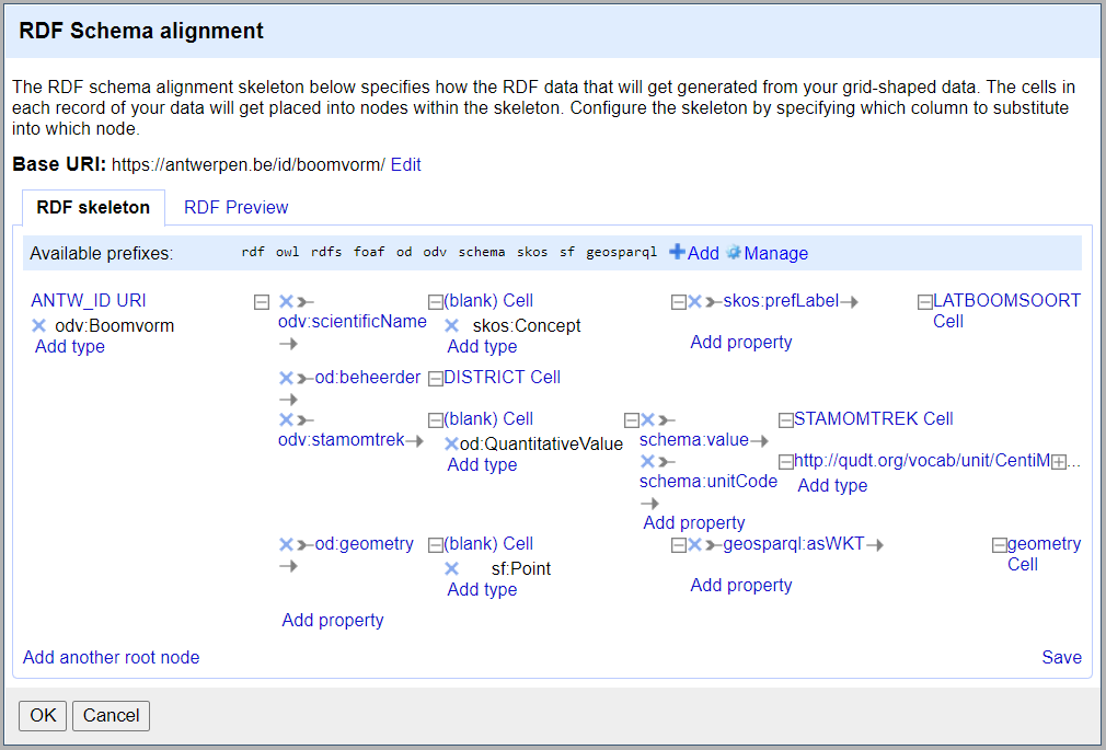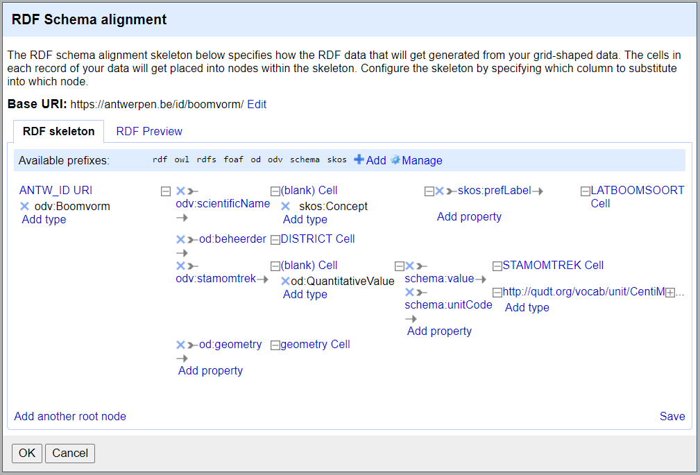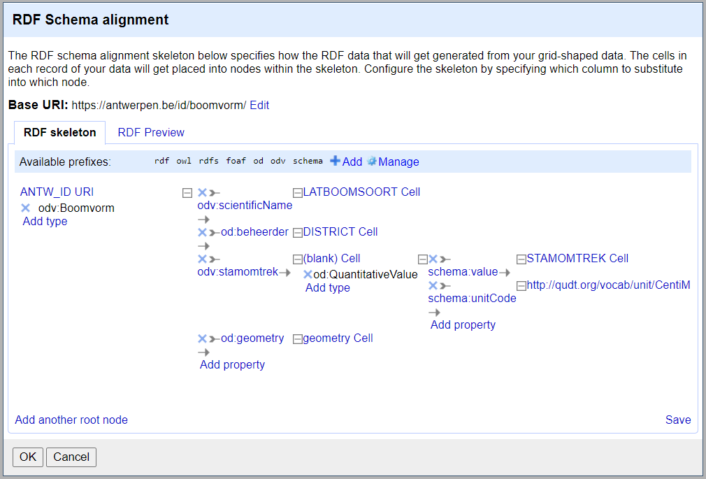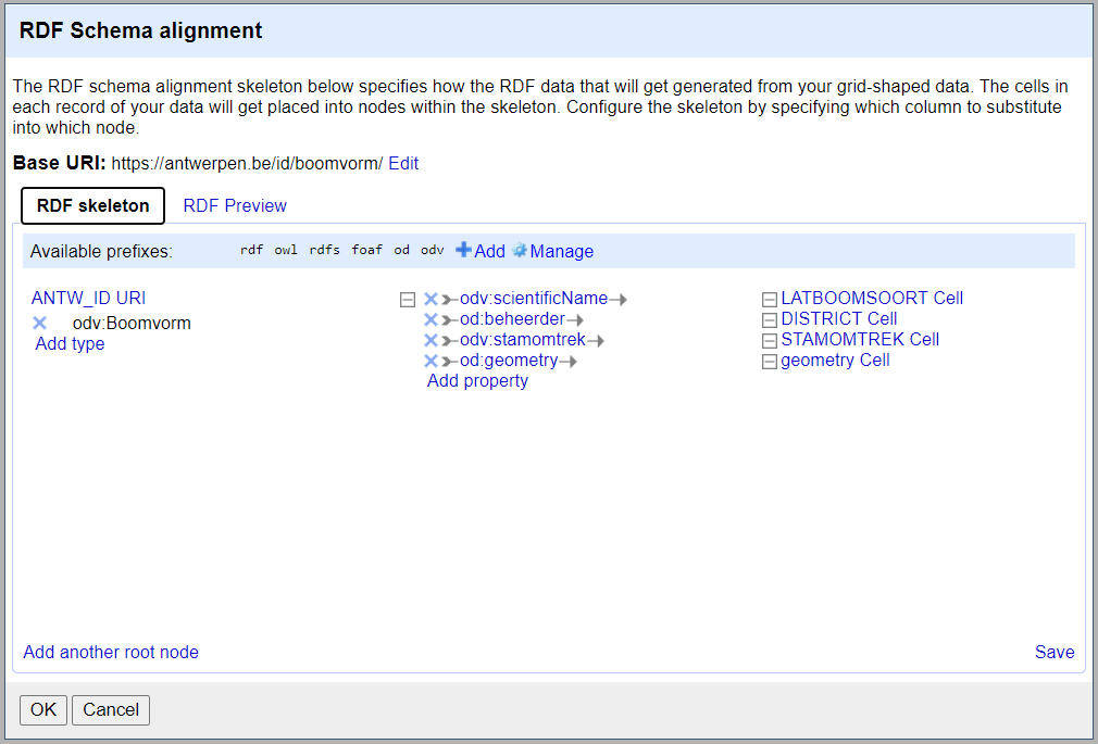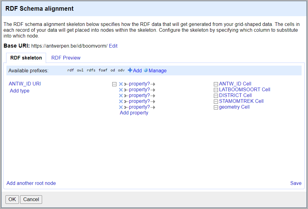 Nu dat stappen 1 tot 3 zijn uitgevoerd, kunnen we beginnen met onze voorbeelddataset semantisch te verrijken door alle data te mappen naar de relevante concepten uit OSLO Openbaar Domein. Dit doen we via de RDF-extensie en meer specifiek, de functie Edit RDF Skeleton. Deze functie opent een venster waarin we de volledige mapping kunnen specifiëren.