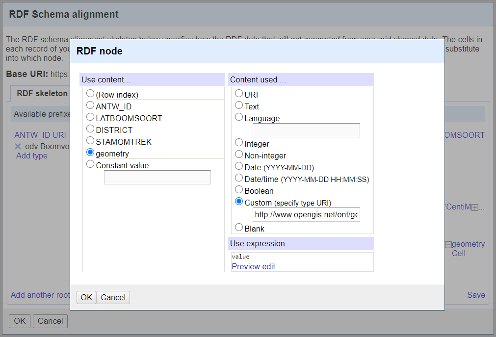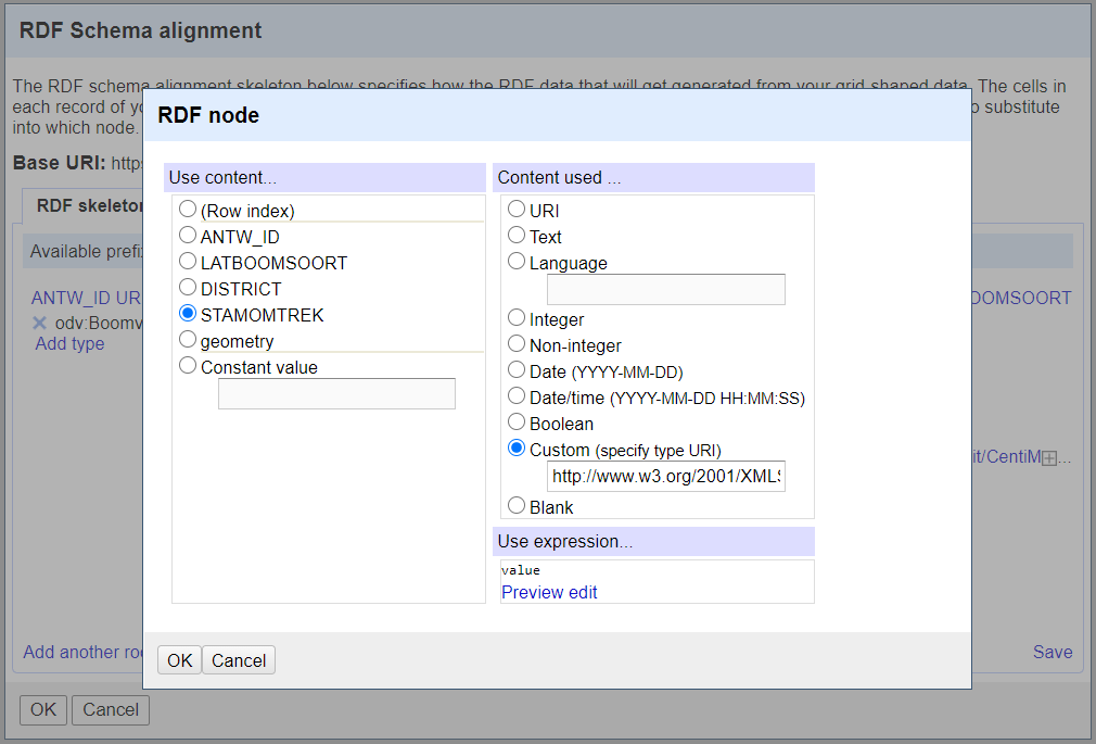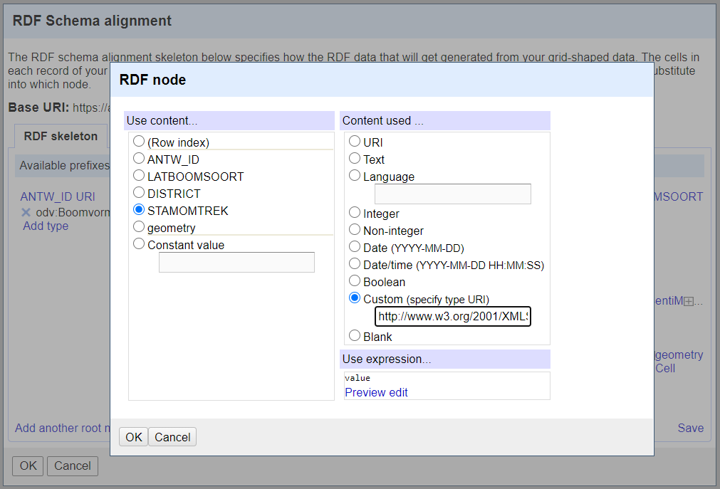 Vervolgens moeten we bepalen welke eigenschap gebruikt zal worden om de base URI te vervolledigen om een unieke URI te kunnen creëren per instantie. Dit kan via de functie (Row index) URI. In ons voorbeeld gebruiken we de kolom ANTW_ID om unieke URI’s te creëren per Boomvorm. Een URI van een Antwerpse boom wordt dus bijvoorbeeld https://antwerpen.be/id/boomvorm/63722.