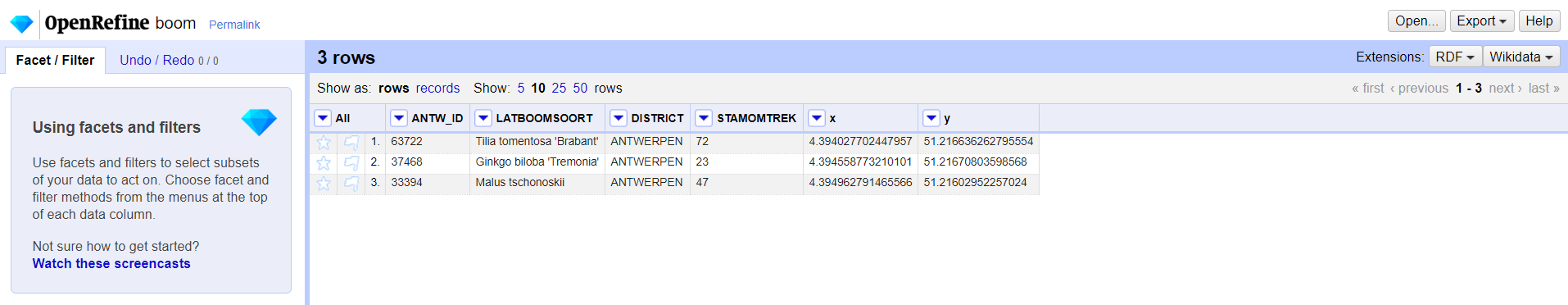 We importeren de data uit Tabel 1 (in .csv-formaat) in OpenRefine en maken een project aan. De tabulaire data moet zo geordend zijn zodat elke rij één object (bv. een Boomvorm) beschrijft en elke kolom een eigenschap van dat object (bv. stamomtrek). De figuur hieronder geeft de geïmporteerde data weer. Via deze link kan je de dataset met de gegevens over deze drie bomen downloaden.