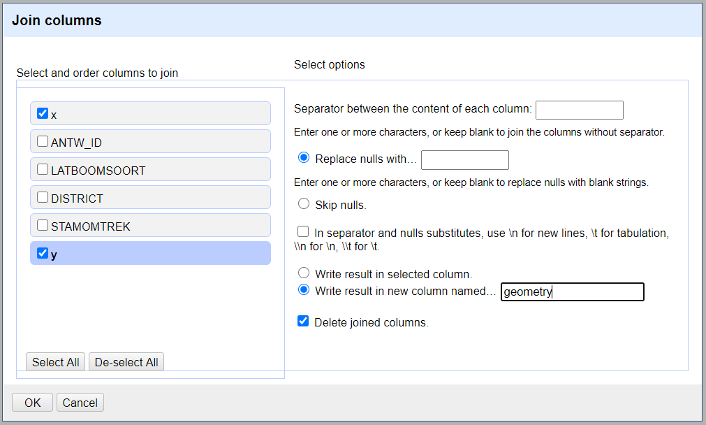 Voor de geografische informatie werken we hier met het WKT-formaat. OSLO laat daarnaast ook toe om met het GML-formaat te werken. Merk op dat het mogelijk is om het gebruikte coördinatenstelsel mee te geven bij een WKT-literal (en bij een GML-literal), bv. "<http://www.opengis.net/def/crs/OGC/1.3/CRS84> POINT(33.95 -83.38)"^^<http://www.opengis.net/ont/geosparql#wktLiteral>. Indien er echter geen coördinatenstelsel wordt gespecifieerd, wordt er standaard uitgegaan van WGS 84, het meest gebruikte coördinatenstelsel. De kolommen [x] en [y] omvormen naar één kolom [geometry] in het WKT-formaat kan via (1) de functie Edit column > Join columns op de kolommen [x] en [y] met een spatie als separator (niet zichtbaar in de figuur).