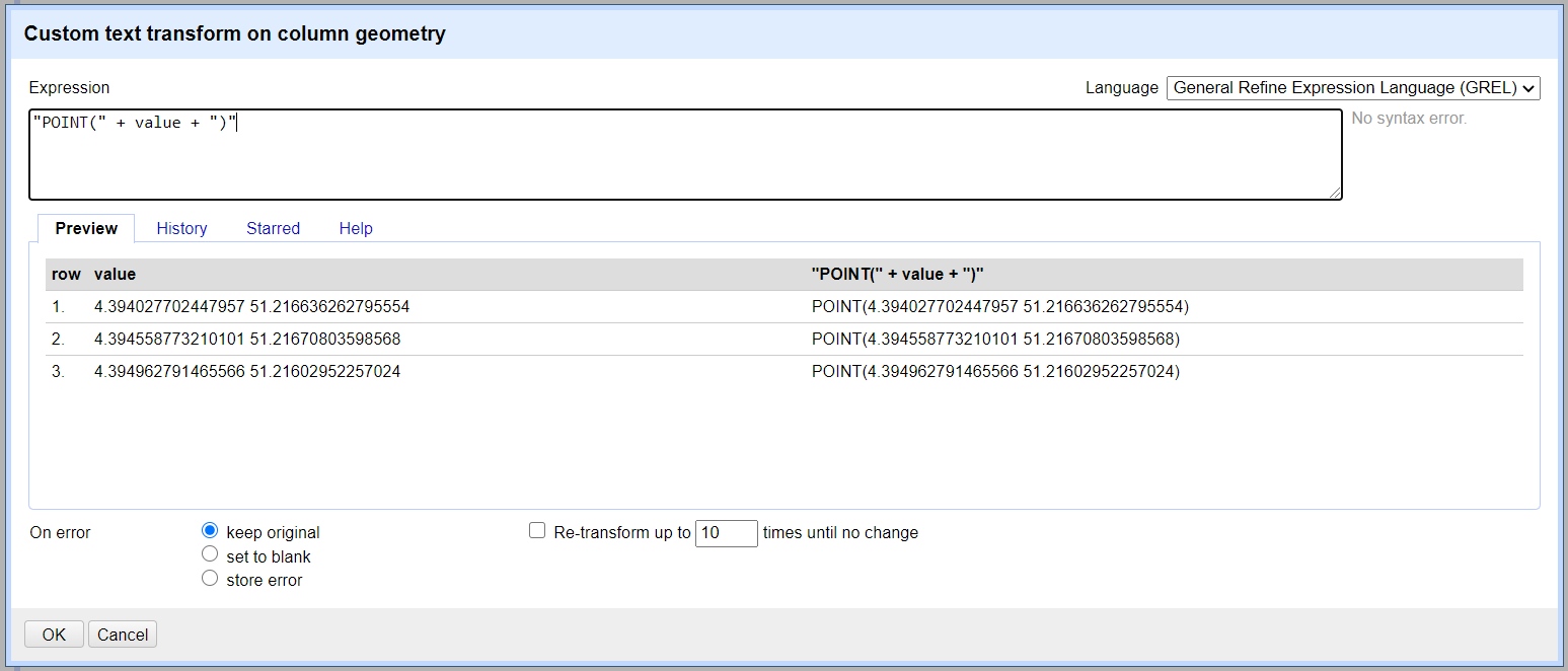 Vervolgens kan men de vereiste prefix en suffix voor de WKT-literal toevoegen via (2) de functie Edit cells > Transform met als expressie "POINT(" + value + ")". Merk op dat we hier geen coördinatenstelsel expliciet definiëren. Indien dit echter nodig is, kan dit eenvoudig via de bovenstaande expressie uit te breiden.