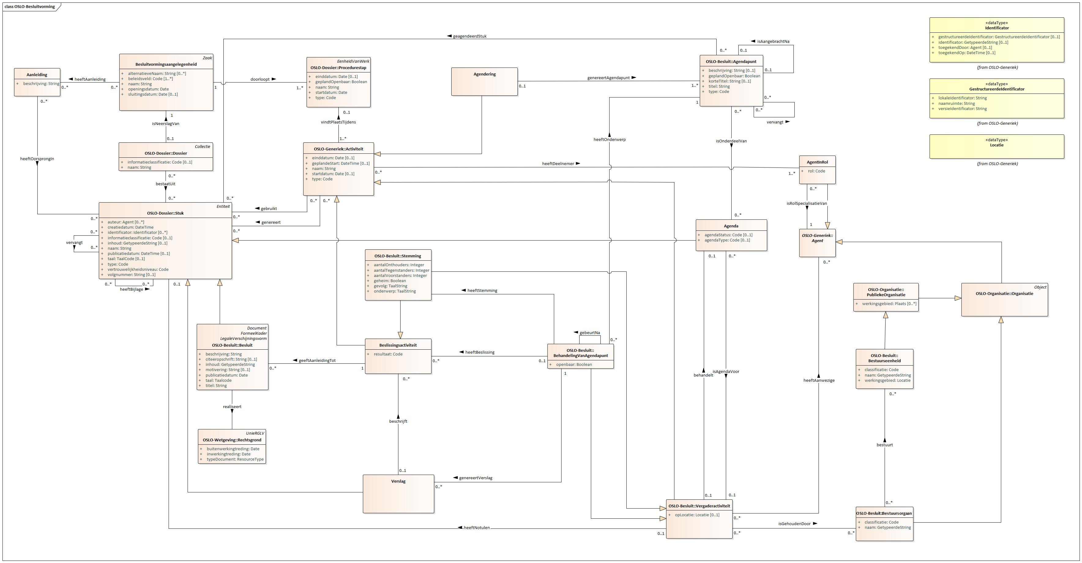 Dit applicatieprofiel herbruikt zoveel mogelijk bestaande vocabularia, specifiek werden binnen OSLO termen herbruikt uit OSLO Dossier, OSLO Besluit, Drie klassen vormen de basis van het besluitvorming applicatieprofiel: De Besluitvormingsaangelegenheid bestaat uit een samenhangende hoeveelheid activiteiten met een Aanleiding en een beoogde Beslissing. Samenhorende activiteiten worden gegroepeerd in een Procedurestap. Een aangelegenheid kan verschillende Procedurestappen doorlopen. Samen vormen deze klassen een beschrijving van het werk dat wordt uitgevoerd tijdens het besluitvormingsproces. Elke Besluitvormingsaangelegenheid heeft een bijhorend Dossier. Dit dossier is een samenhangend geheel van Stukken. Het Dossier is de neerslag van de Besluitvormingsaangelegenheid. De Agendering en bespreking van een Besluitvormingsaangelegenheid kregen extra aandacht binnen het applicatieprofiel. De relevante klassen bevinden zich voornamelijk aan de rechterkant van het UML-diagram. Sommige types van activiteiten kregen hier hun eigen klasse: Agendering, BehandelingVanAgendapunt, BeslissingsActiviteit en Stemming. Er werd gekozen deze als klasse op te nemen omdat ze specifieke relatie(s) met een andere klassen in het diagram hebben. De Beslissingsactiviteit kan aanleiding geven tot een Besluit, bijvoorbeeld bij het besluit tot bekrachtiging van een decreet door de Vlaamse Regering. Een Besluit, ten slotte, is een intellectuele realisatie van een Rechtsbron en houdt een rechtshandeling in waarbij sprake is van een beoogd rechtsgevolg. Het Besluit kan worden opgenomen in een register zoals bijvoorbeeld de Vlaamse Codex.