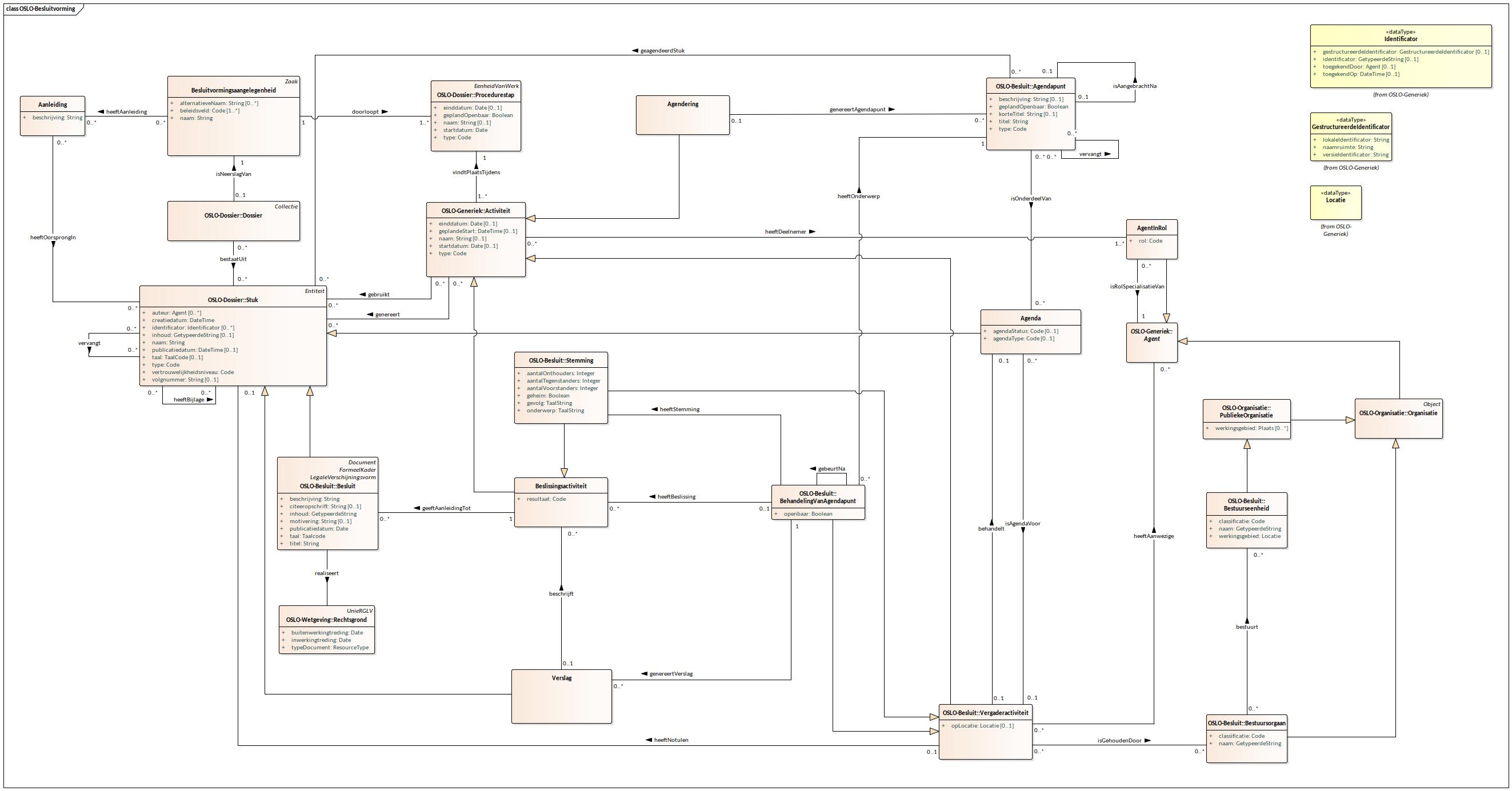 Dit applicatieprofiel herbruikt zoveel mogelijk bestaande vocabularia, specifiek werden binnen OSLO termen herbruikt uit OSLO dossier, OSLO besluit, Drie klassen vormen de basis van het besluitvorming applicatieprofiel: De Besluitvormingsaangelegenheid bestaat uit een samenhangende hoeveelheid activiteiten met een aanleiding en een beoogde beslissing. Samenhorende activiteiten worden gegroepeerd in een Procedurestap. Een aangelegenheid kan verschillende procedurestappen doorlopen. Samen vormen deze klassen een beschrijving van het werk dat wordt uitgevoerd tijdens het besluitvormingsproces. Elke besluitvormingsaangelegenheid heeft een bijhorend dossier. Dit dossier is een samenhangend geheel van stukken. Het dossier is de neerslag van de besluitvormingsaangelegenheid. De agendering en bespreking van een besluitvormingsaangelegenheid kreeg extra aandacht binnen het applicatieprofiel. De relevante klassen bevinden zich voornamelijk aan de rechterkant van het UML diagrama. Sommige types van activiteiten kregen hier hun eigen klasse: Agendering, BehandelingVanAgendapunt, BeslissingsActiviteit en Stemming. Er werd gekozen deze als klasse op te nemen omdat ze specifieke relatie(s) met een andere klassen in het diagrama hebben. De Beslissingsactiviteit kan aanleiding geven tot een besluit, bijvoorbeeld bij het besluit tot bekrachtiging van een decreet door de Vlaamse Regering. Een besluit, ten slotte, is een intellectuele realisatie van een rechtsbron en houdt een rechtshandeling in waarbij sprake is van een beoogd rechtsgevolg. Het besluit kan worden opgenomen in een register zoals bijvoorbeeld de Vlaamse codex.
