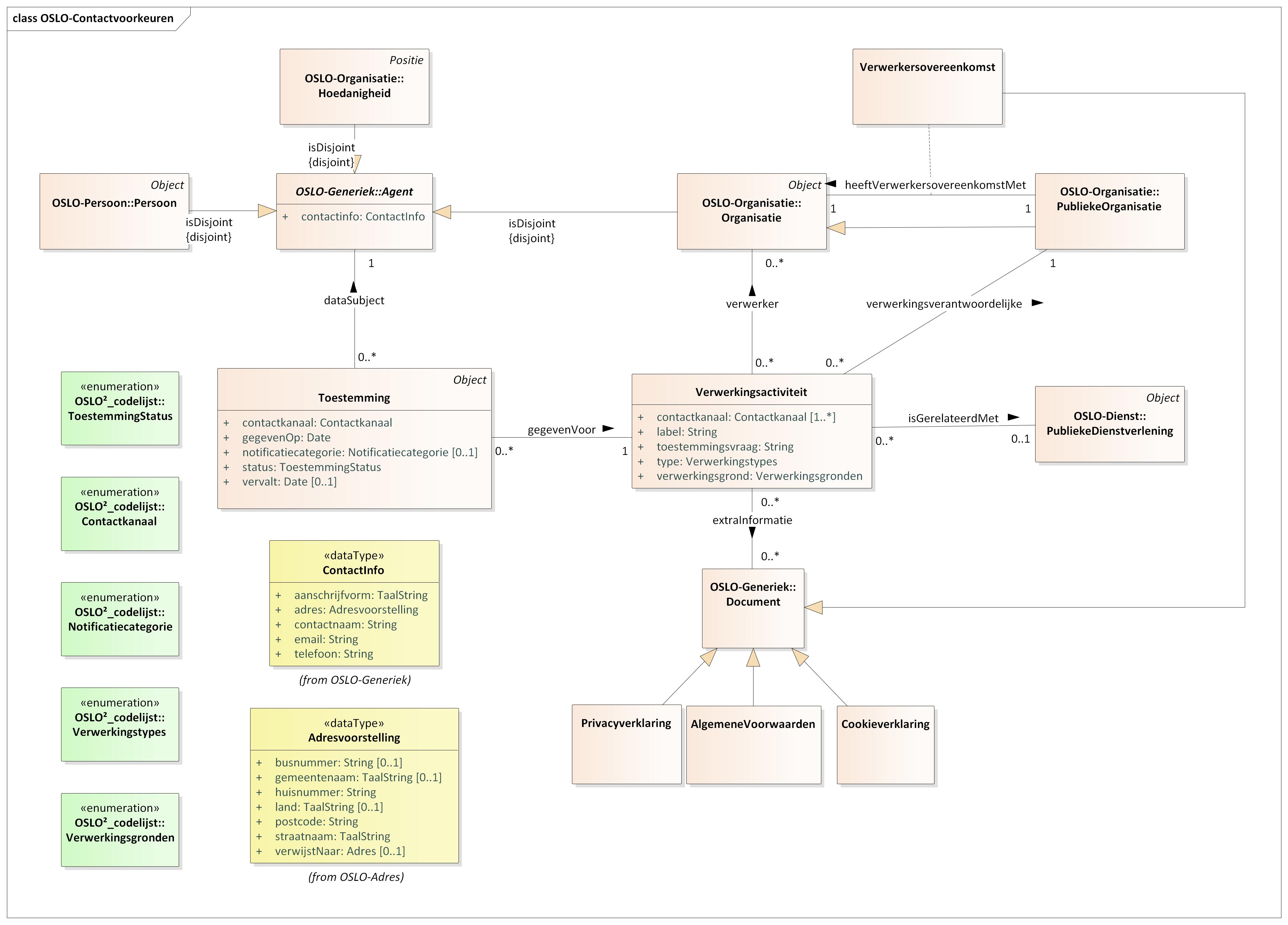 Dit applicatieprofiel beschrijft een informatiemodel voor een toepassing met als use case het gestructureerd beschrijven van contactvoorkeuren van burgers en ondernemers. Deze specificatie is gebaseerd op de OSLO-Toestemming en OSLO-Notificatie vocabularia en heeft als scope het capteren van de expliciete toestemmingen (consent) die gevraagd worden door Publieke Organisaties om bepaalde verwerkingsactiviteiten te stellen met persoonsgegevens van burgers en ondernemers. Naast een definitie van de verwerkingsactiviteiten waar toestemming voor gevraagd wordt en relevante relaties met andere organisaties die de gegevens zullen verwerken of extra informatie in de vorm van een privacy- of cookieverklaring bevat dit applicatieprofiel ook een entiteit 'Toestemming' waarmee een specifieke toestemming van een Agent voor een bepaalde verwerkingsactiviteit kan gecapteerd worden. Bijvoorbeeld de toestemming om via e-mail een nieuwsbrief te ontvangen van Informatie Vlaanderen in verband met de Dienstverlening die door hen wordt aangeboden.