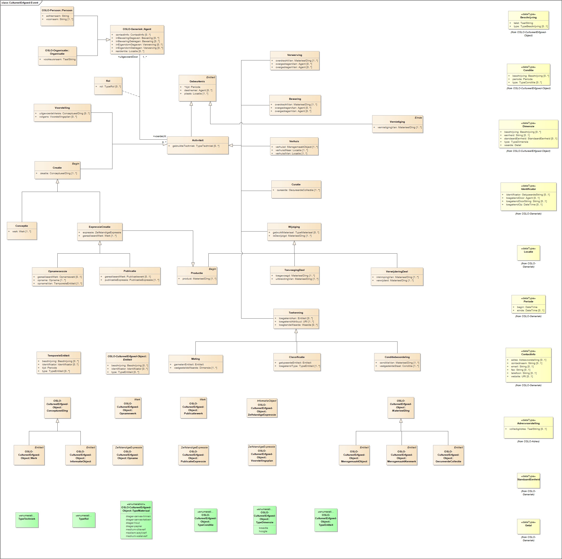 Klassen in het applicatieprofiel OSLO-CultureelErfgoed-event zijn specialisaties van de abstracte klasse Entiteit en erven daarvan kenmerken zoals identificator, beschrijving of type over.