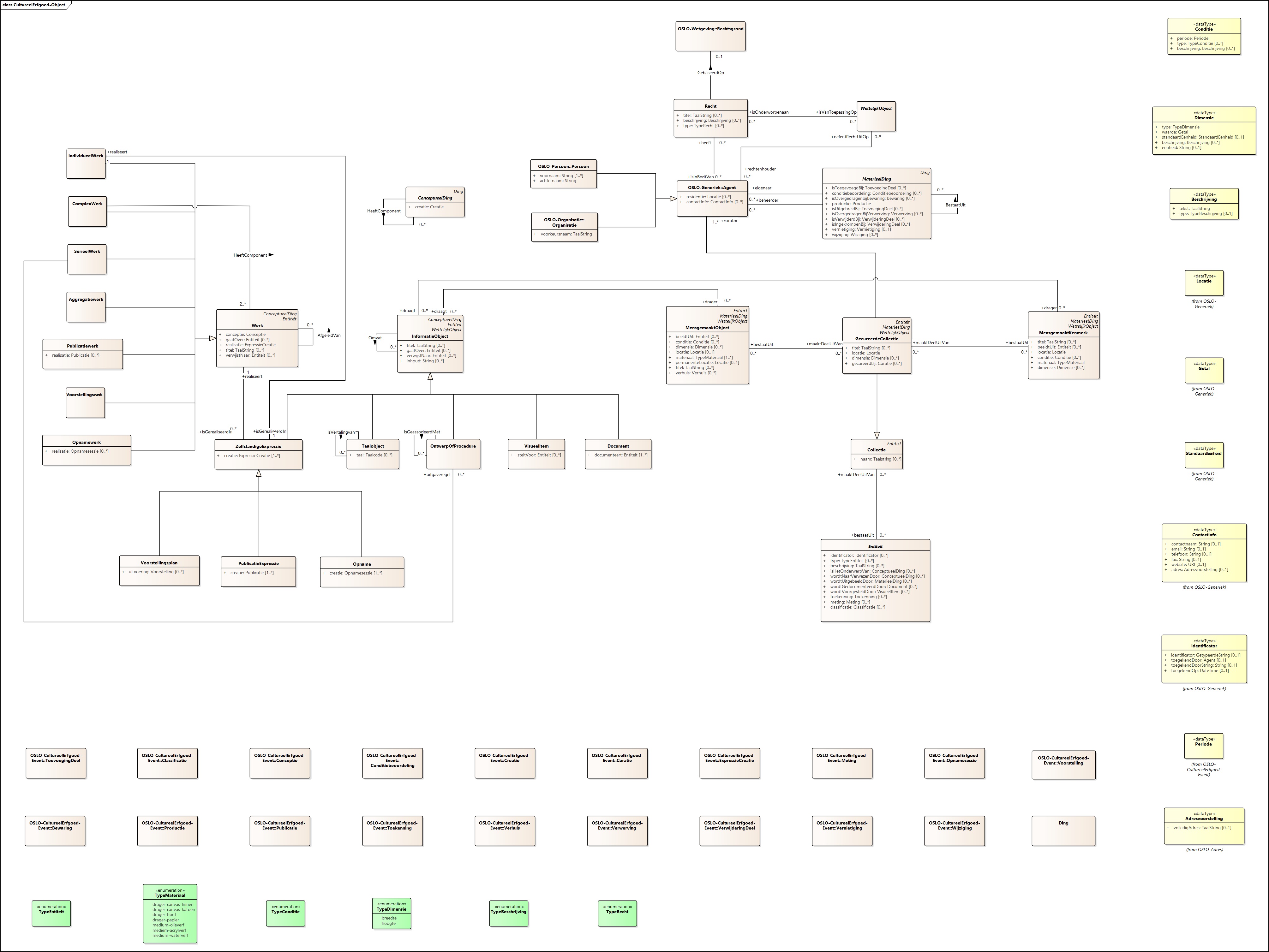 Klassen in het applicatieprofiel OSLO-CultureelErfgoed-object zijn specialisaties van de abstracte klasse Entiteit en erven daarvan kenmerken over zoals identificator, beschrijving of type. Ook associaties tussen entiteiten kunnen op die manier beschreven worden bv om aan te geven welke gebeurtenis op een schilderij wordt afbeeld of om duidelijk te maken van welk kunstwerk een foto werd genomen.