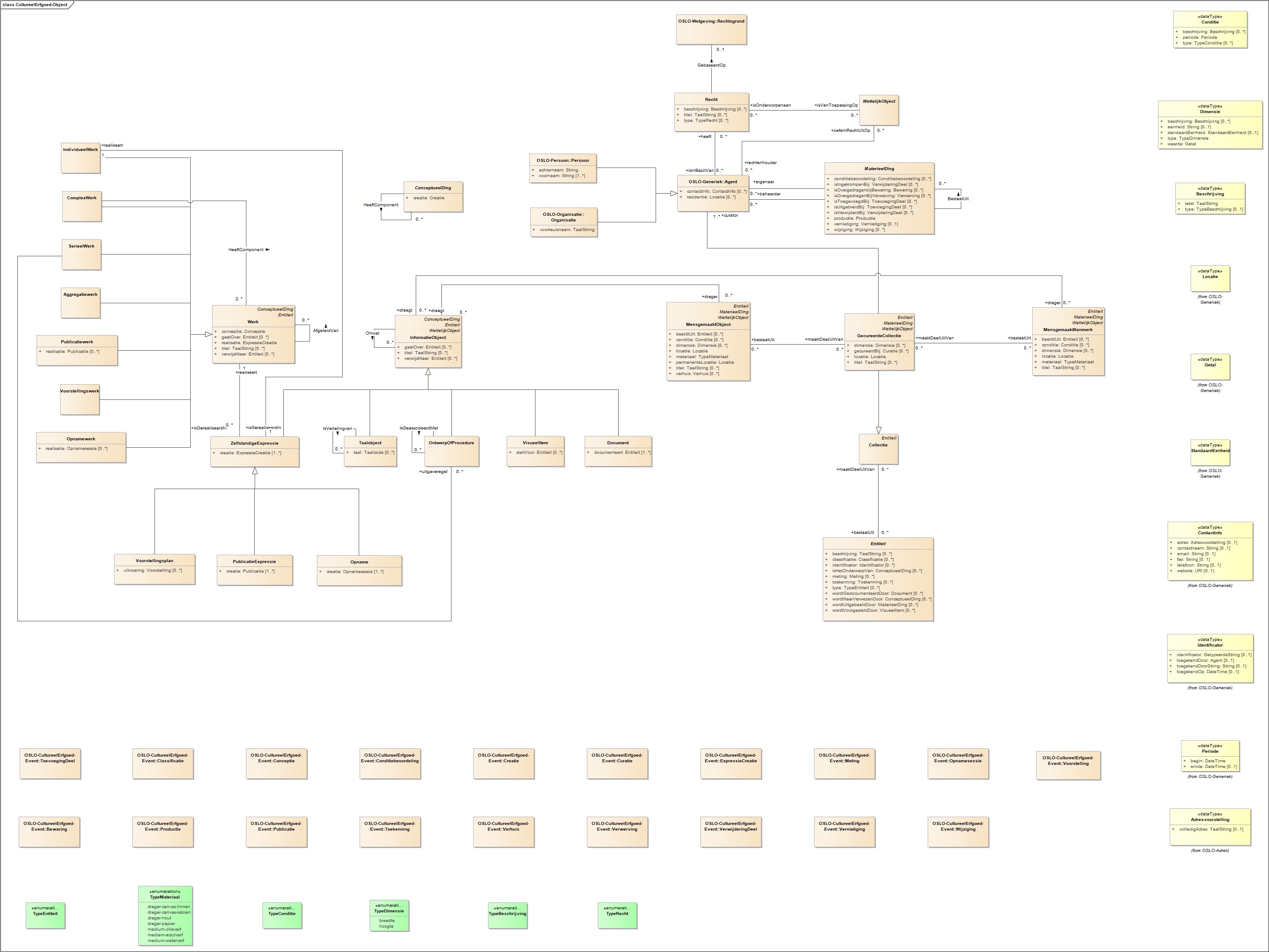Klassen in het applicatieprofiel OSLO-CultureelErfgoed-object zijn specialisaties van de abstracte klasse Entiteit en erven daarvan kenmerken over zoals identificator, beschrijving of type. Ook associaties tussen entiteiten kunnen op die manier beschreven worden bv om aan te geven welke gebeurtenis op een schilderij wordt afbeeld of om duidelijk te maken van welk kunstwerk een foto werd genomen.