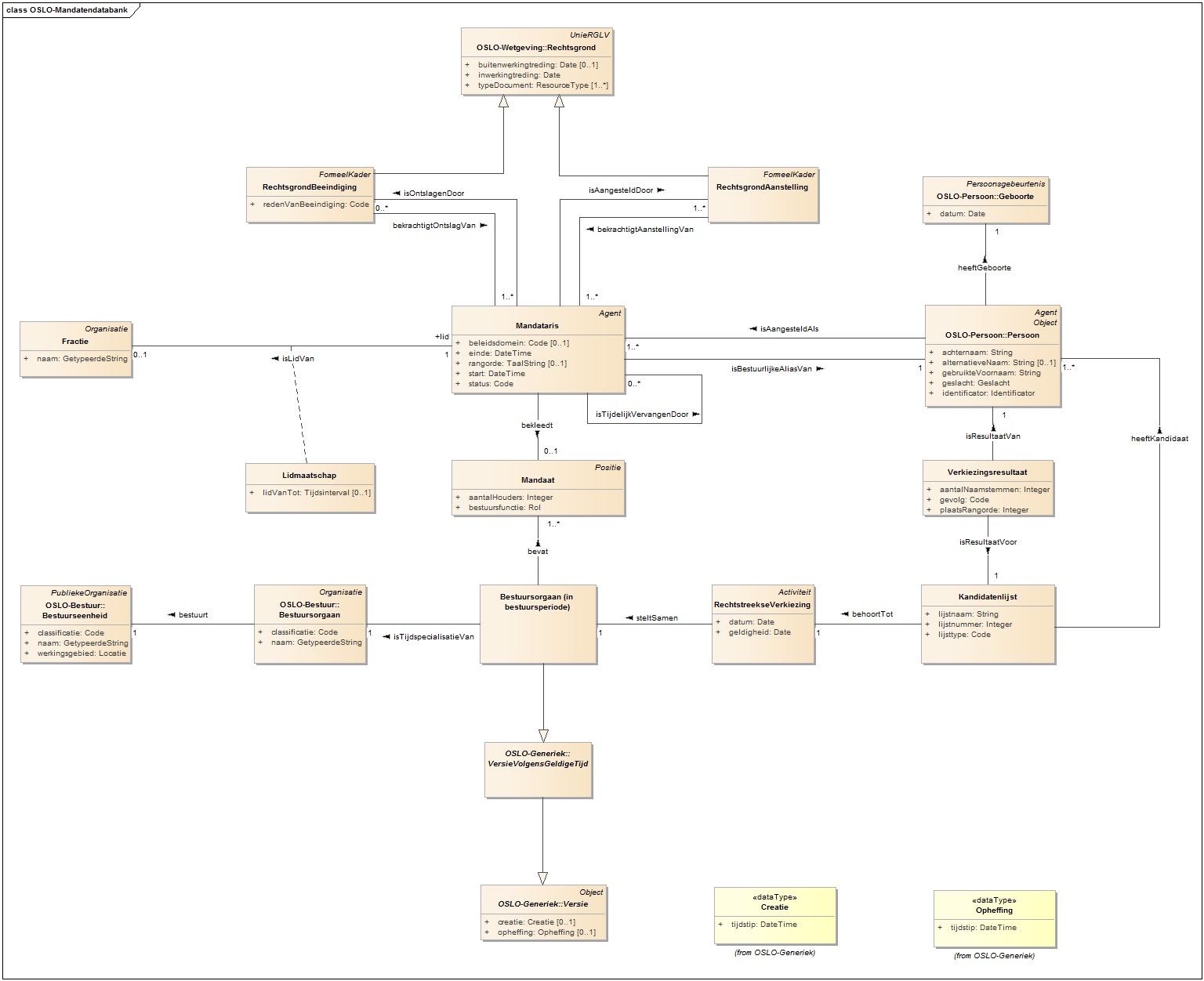 Mandaat | 0...1 | Het mandaat dat deze mandataris bekleedt. | Deze eigenschap is verplicht als de mandataris geen tijdelijke vervanger is van een andere mandataris. | |
