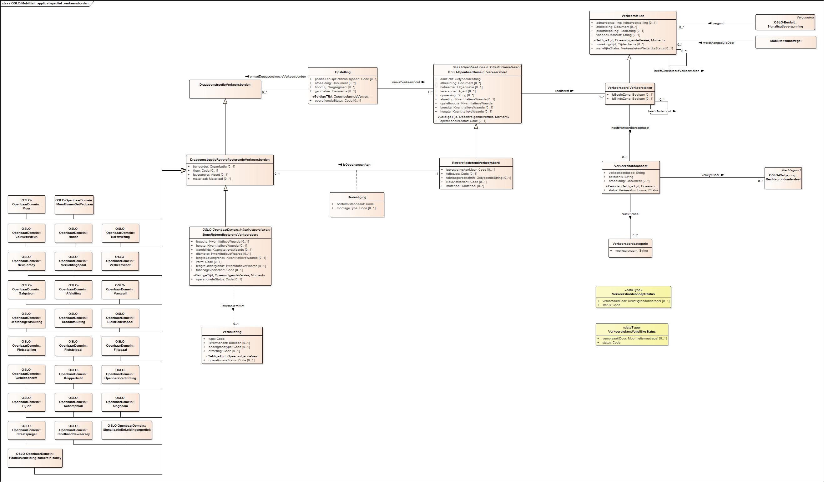 Enerzijds beschrijft dit datamodel basisentiteiten zoals Opstelling, Steun, Bevestiging en Verankering naast het gegeven van het Infrastructuurelement, dat overgenomen wordt uit het vocabularium van het Openbaar Domein om de fysieke aspecten van een verkeersbordopstelling te beschrijven. Anderzijds schrijft het profiel zich in in het applicatieprofiel voor besluiten over mobiliteit voor het aangeven van de legitieme gronden voor de plaatsing van verkeersborden, maar verdiept daarin ook de beschrijving van de betekenis van het verkeersbord met de entiteit Verkeersteken.